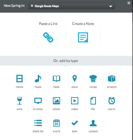 I’ve been using Springpad for this functionality as it has all of the elements highlighted above and is a free app. It also lets you tag destinations with a “want” tag to remind you to visit it at a later time. Notebooks (as they are called in Sprjngpad) can be organized by any headers you feel appropriate such as maps, packing, food, sight-seeing etc. You can even assign tasks to others in your group such as “pack a tarp” or “bring the Whiskey” (two items I need to remember on this upcoming trip).