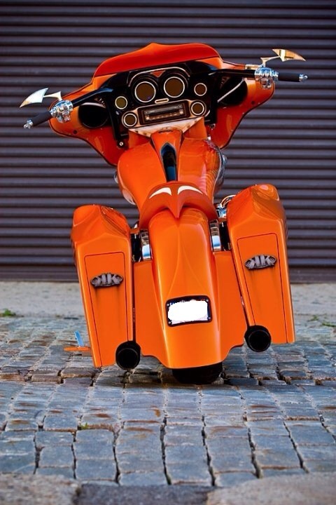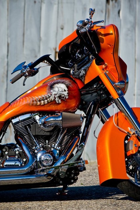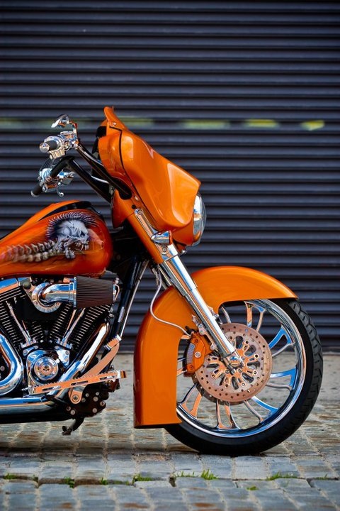 The bags are a combination on sinister industries bags and side cover along with Bagger concepts loud lids but all molded together. We made rear opening doors from acrylic to mount lights internally to shine out. 21″ renegade aspen in chrome. Rinehart mufflers with v&h dresser dual header pipes. PCV. Screamin eagle heavy breather intake. Sinister industries rear and front fender, stretched tank, dash kit, lower dash kit with factory ignition eliminator, windshield, chrome saw blade floor boards, 12″ bars, and license plate frame. Custom made seat pan and material used was tangerine genuine leather and white and tangerine stingray imported from Thailand. Arnott rear Air ride. Chrome front end. Painted to match calipers. Lamborghini orange pearl paint. Clarion flip up deck with mb quart q series component speakers up front and Bagger concepts Amp and rear speakers. Dakota digital gauges. Front lowering springs 2″.