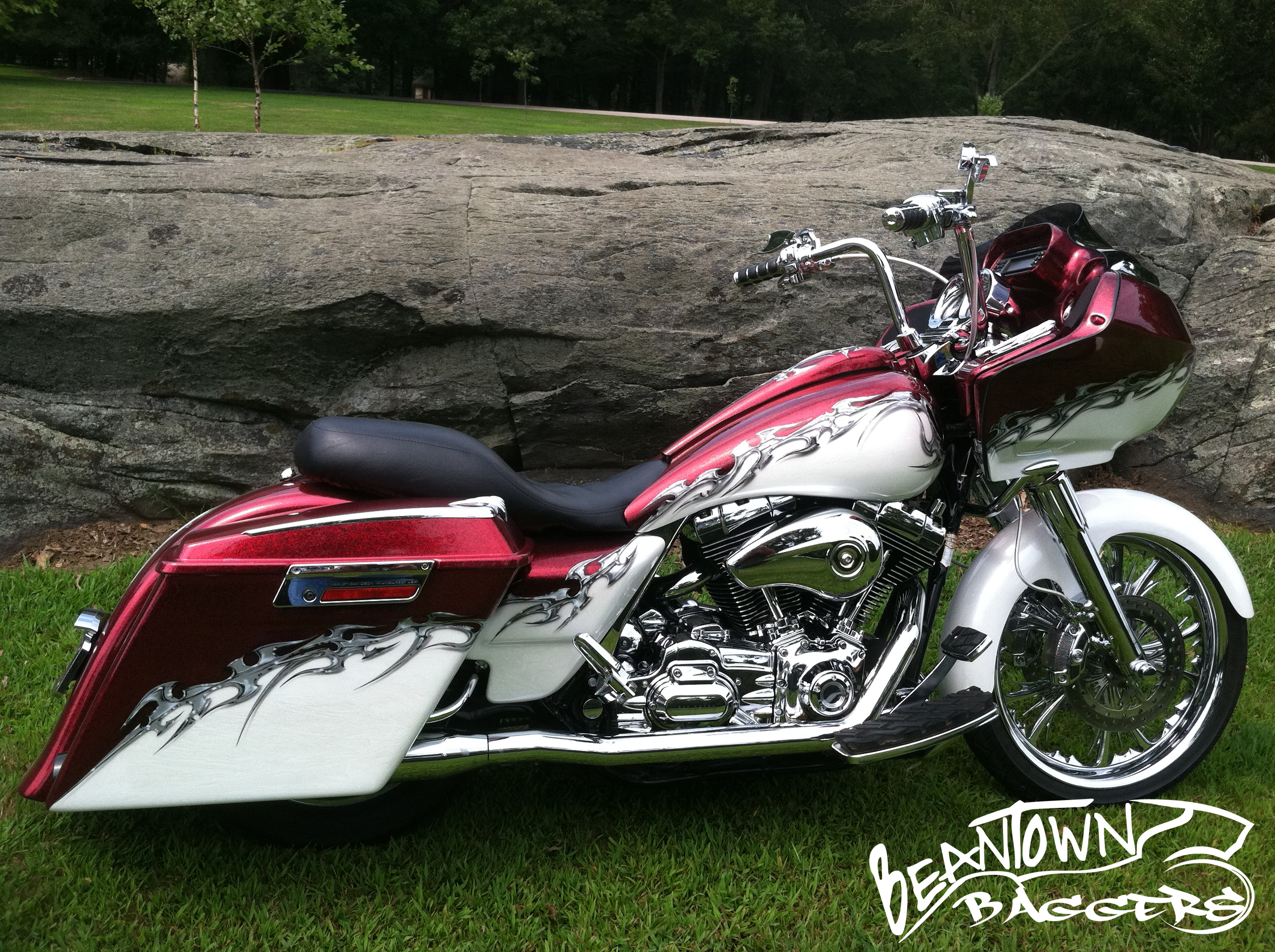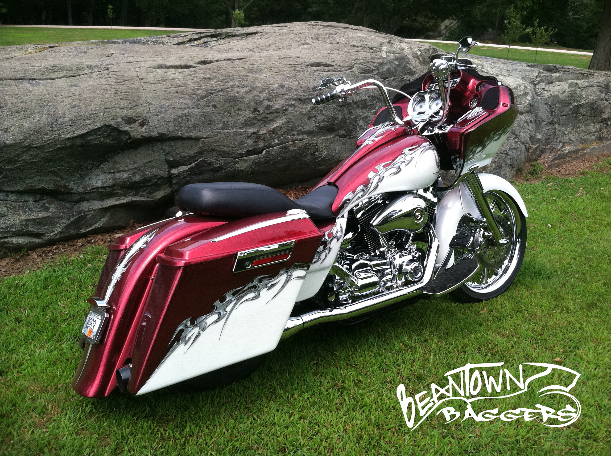 I ripped this bike down to almost nothing and started  the rebuild with stretched bags and fender, a Yaffe stretched tank. The front fender started off as a 180 fender blank and was cut and shaped. RC Components wheels with Metzeler tires. Rinehart true duals, Dakota Digital gauges, Rockford Fosgate 300 watt amp and 4 speakers in the faring,  Mini Apes for bars. Then came the Paint. We laid down White marbleized pearl and a heavy red metallic. Then Anthony’s Airbrush did the tribal graphics. rw rg3 rw rg2