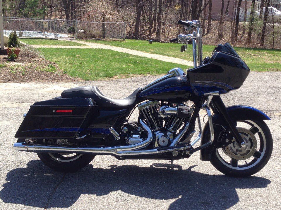 Audiobarn in Exeter, NH put a crazy stereo in too… Kenwood deck with ipod / iphone hook up in the front pocket, arc audio 4 channel amp, with Hertz High Energy 6 1/2’s in the front, and 6×9’s in the cycle sounds lids in the back