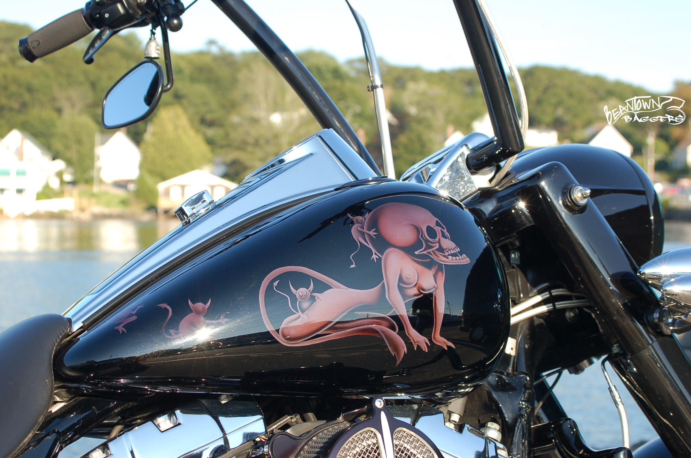 Next, he had to get this work to his painter. The owner had worked with Mitch Omar before with incredible success. You may have heard of Mitch or O’s Custom paint as he was the person responsible for painting many of the late Bruce Rossmeyer’s personal cycles. Several digital zooms and emails later, Mitch knew what the tank art would look like. It would be ghosted black and would jump out with the sunshine. Without the sun, at the distance, it would be vivid black.