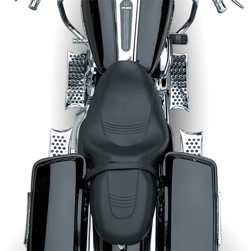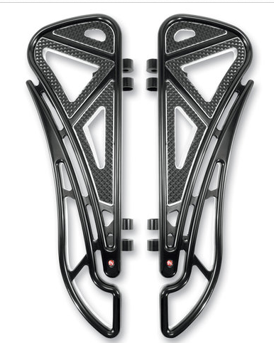 The newest floorboards by Battistini are the Wireframe line that could easily be confused with shrunken chrome snowshoes. The asymmetrical shape is definitely a change from the rectangular floorboards of the past and look incredible on the newest baggers. These wireframe floorboards come in four styles including: anodized black, chrome, chrome and black and contrast. Take a look at the battistini site for more info.