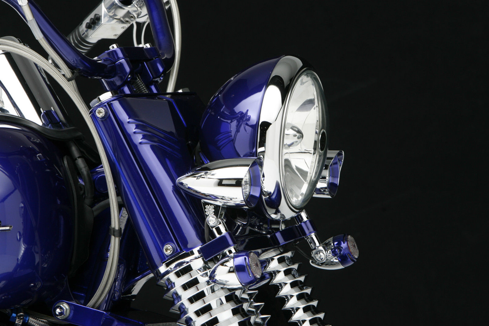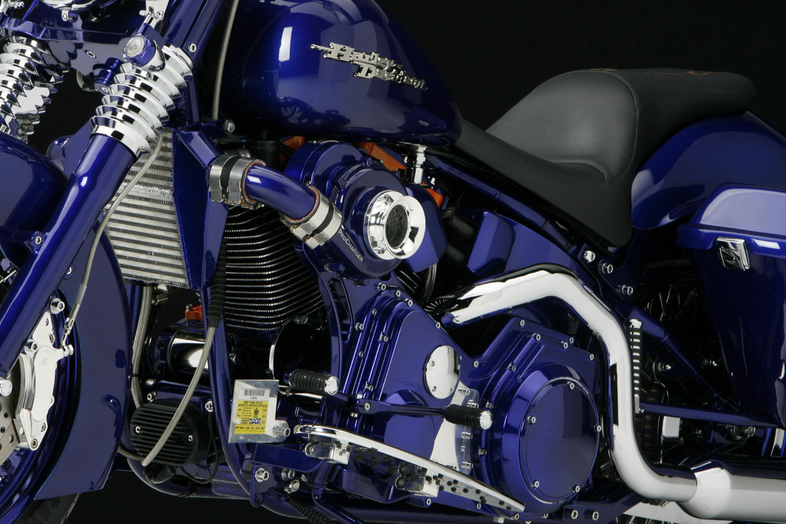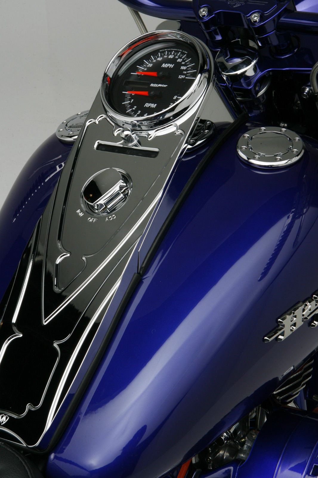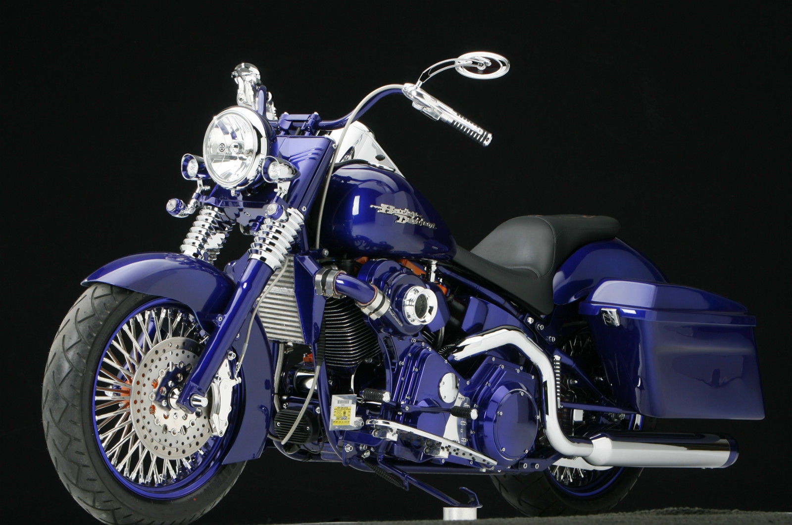 Kirk VanScoten had purchased a new Heritage Softail from Utica HD a couple years ago using it for new model fender and saddle bag fitment. Color and design are the two essentials when making a custom scoot. Kirk had come up with a new bluish purple powder that had tremendous depth to it. The design idea came when Walt Sipp of Pro Charger, who Sumax powder coats products for, asked Kirk if he wanted to do a marketing project together.