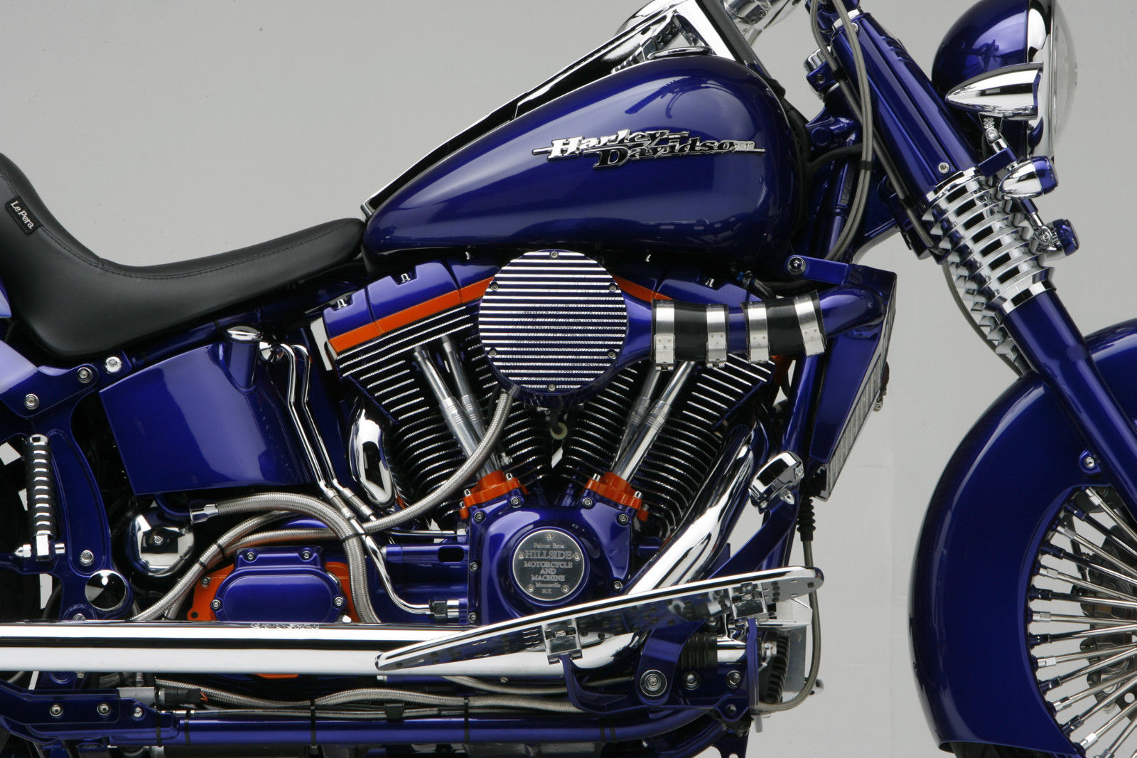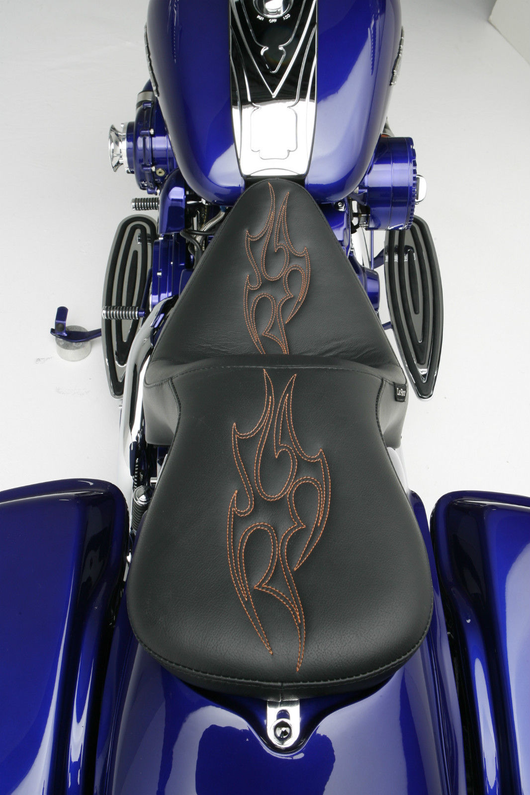 The Heritage front end is a classic. Headwind 2″ spots, Kuryakyn directionals and Arlen Ness retro boots add some bling. The Hugger front fender is a popular Sumax composite glass fender. Stock HD Fat Bob tanks with chrome Harley logos give the look of a Street Glide. Handle bars are stock with Jay Brake handle bar master cylinders and controls. Autometer’s speedo / tach sits in the Arlen Ness dash. Ness mirrors, grips and floorboards complete the look. Kirk fabricated a rear sub fender and fender overlay for the bagger theme out of their composite glass. Bob at LePera accented the rich looking Sorrento custom seat with orange tribal flame stitching. It sits down inside the overlay for a sculptured look. The Sumax saddle bags feature a pair of 1939 Ford style LEDs with “run, turn & stop” functions.