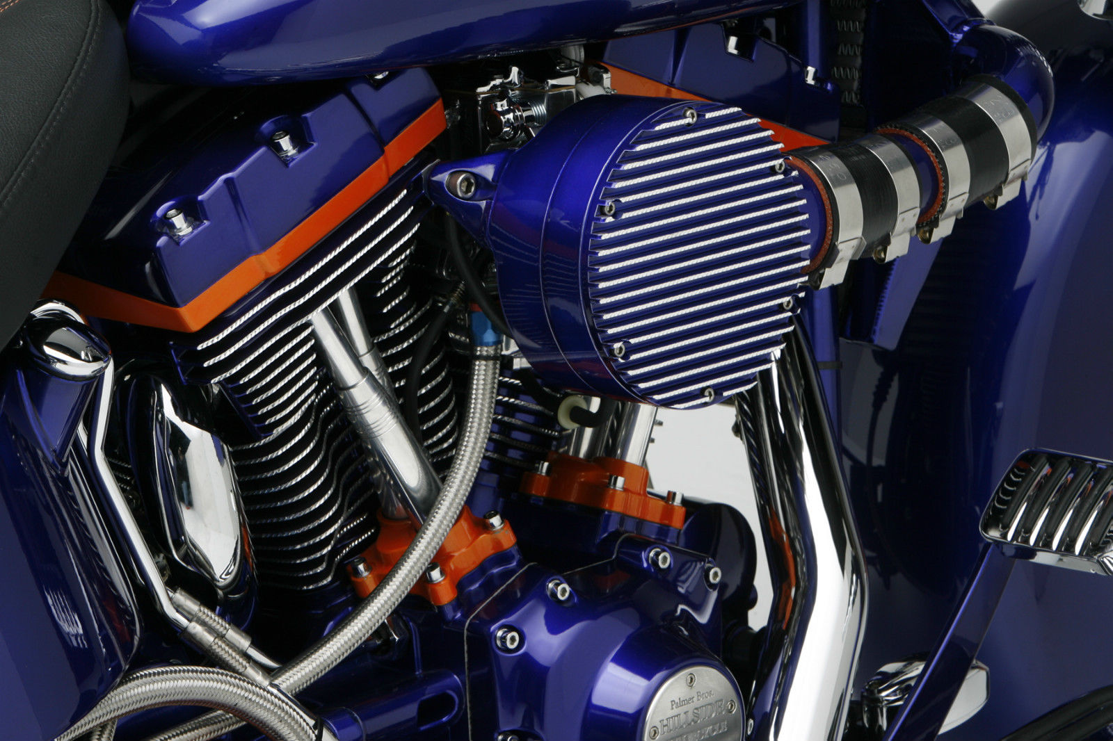 With the bike completely disassembled, the motor went to Hillside Cycle where the Palmer brothers did their motor magic. Kirk had in mind a motor he had in one of his former street rods, a blown small block. With that idea they kept it to 88 inches, and then pulled out all the stops starting with their Stage II heads and Woods TW6G cams. S&S lifters and push rods with Sumax push rod billet covers. Kev installed the Pro Charger supercharger. Since this was the first Pro Charger unit to use a carburetor, Kev worked with their R&D to design and install. Electronic fire power is provided by Daytona Twin Tec’s Twin Cam Ignition Kit. The Taylor Thundervolt Spark Plug wires and Extreme Duty Battery Cables transfer the fire power. Russell braided oil lines keep the oil flowing. Motion Pro provided the cables. Diamond Heads added their bling with Show Cutting the Heads, Cylinders and Mikuni Carb cover. Samson’s Custom Shop Step True Dual exhausts were replaced with a Thunderheader for more performance. Gardner Westcott chrome allen fasteners were used throughout the build. We asked Kirk just how the blower motor works. “It has the balls of a grizzly. Kev set the bike up so that it is very smooth at all speeds, it does not lurch. Twist the wick and your eyeballs land in the back of your sockets. We expect the horsepower in the 150-170 range when broken in and dyno tuned.”