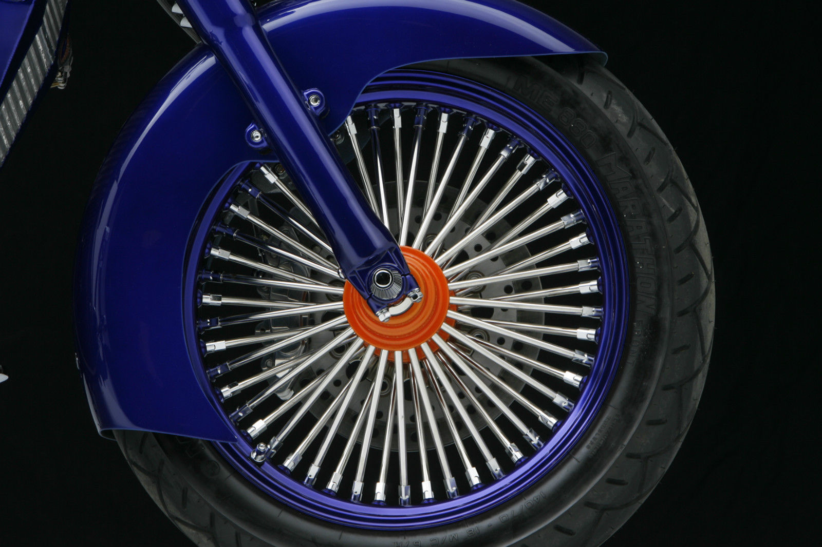 Big Spoke 18″ wheels are from Ride Wright. Sumax powder coated the hubs orange and the wheels their Bentley Blue. Metzler ME880 skins front and rear. Rotors and brake lines by Russell while all braking is done by Jay Brake Calipers.