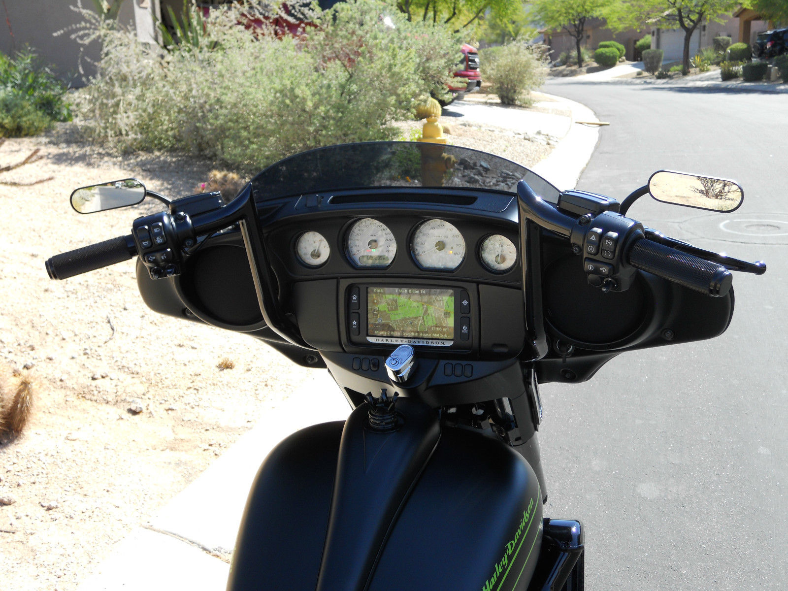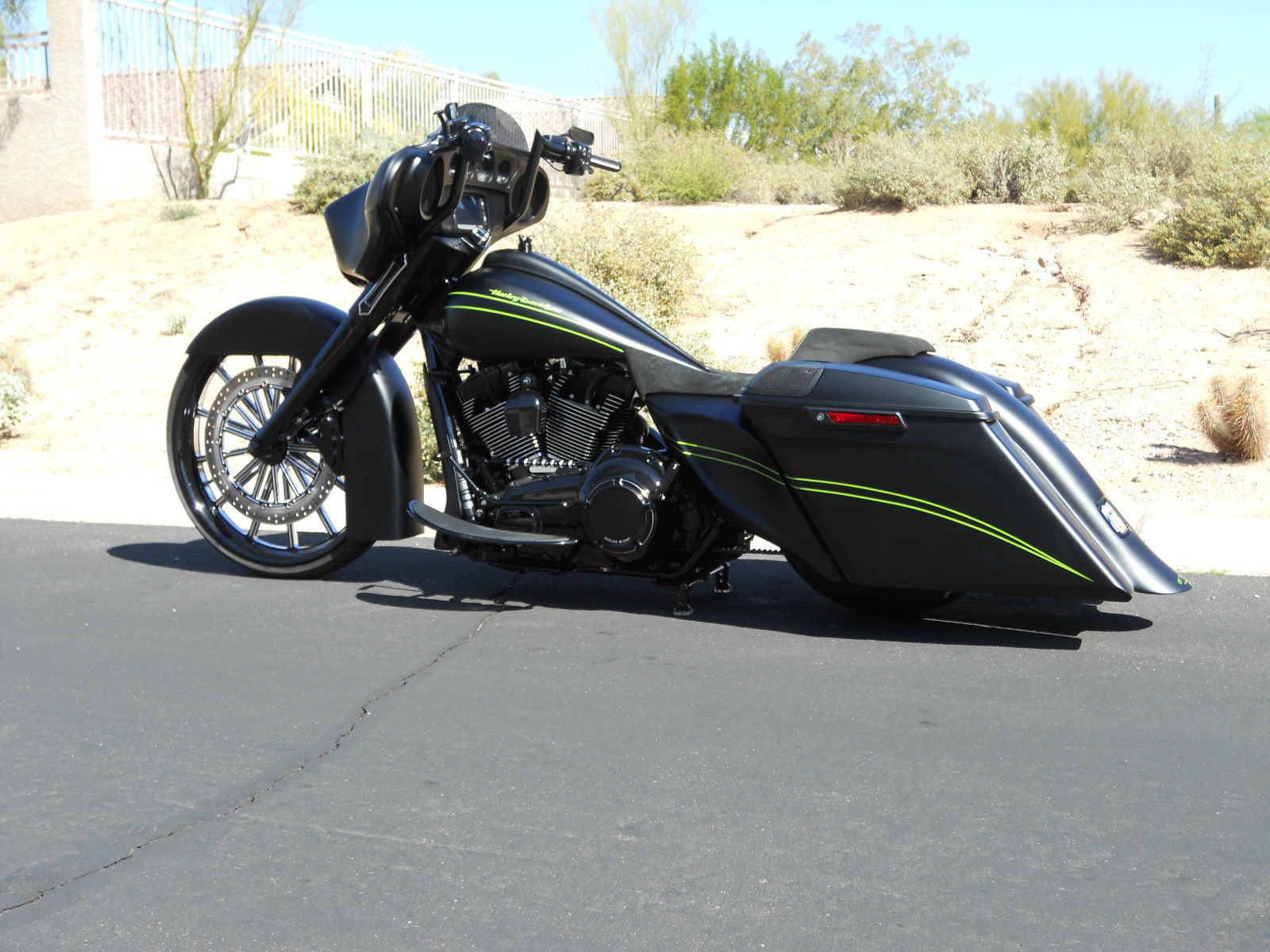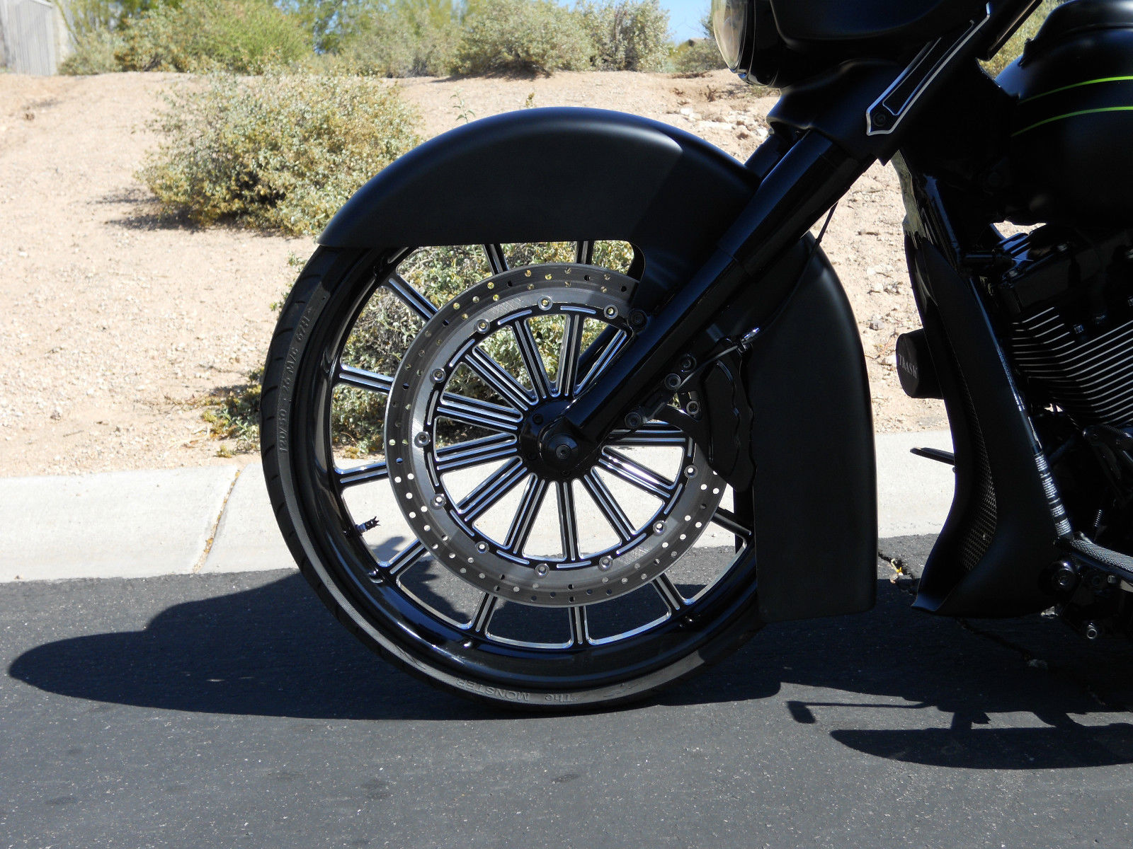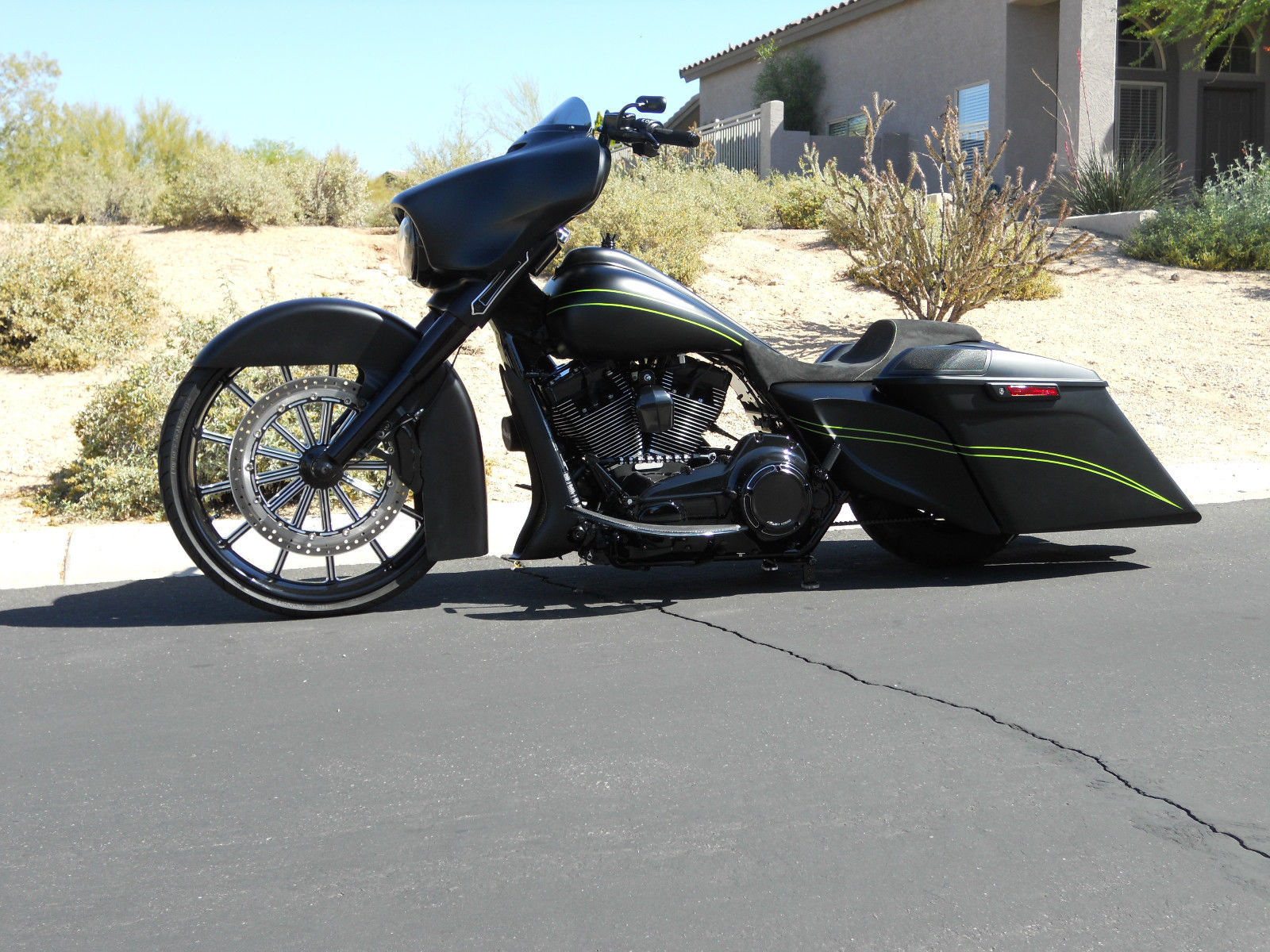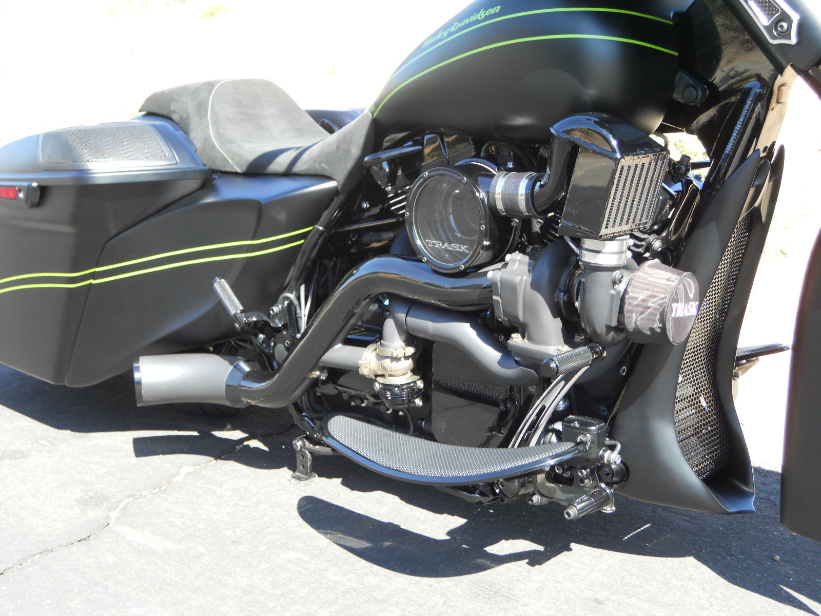 Motor is stock with a Trask turbo, neck is cut and raked with using HHI rake neck builders kit. Blacked out motor, custom made to match front wheel 18 inch front rotor with 6 piston caliper, Cut and sectioned front fairing to compensate light for the rake. All wires are run through the frame for a clean look. Bars have wires, brake line and clutch line ran inside the bars to give a very clean look.