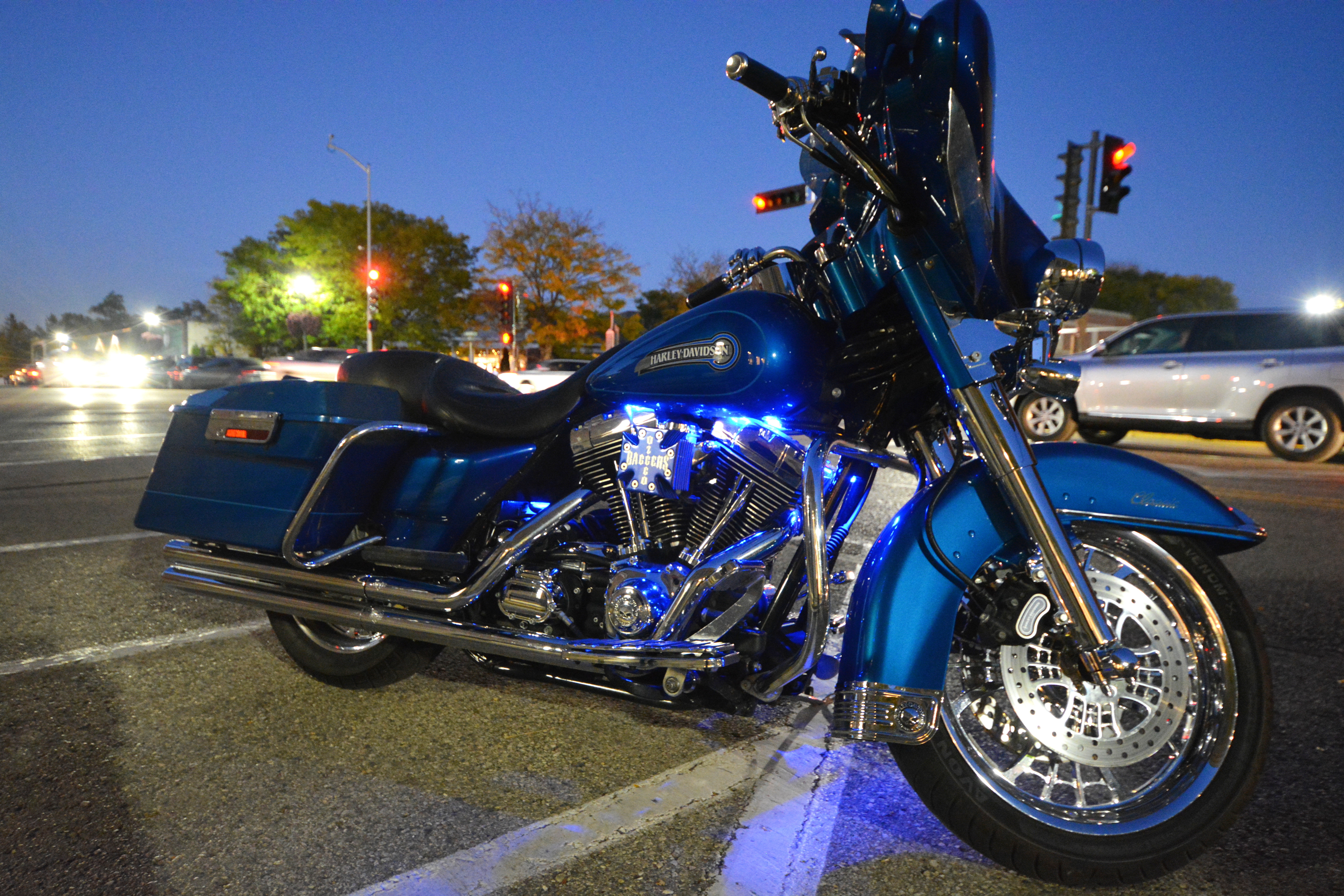 Yesterday’s ride to Lake Geneva Wisconsin had a few great surprises. Not least of which was catching up with Kyle “The Tree Doctor” Krueger and shooting his 2007 very modified full dresser. The work was well done, tasteful and taking these shots at night really brought out the metallic blue of the tins!