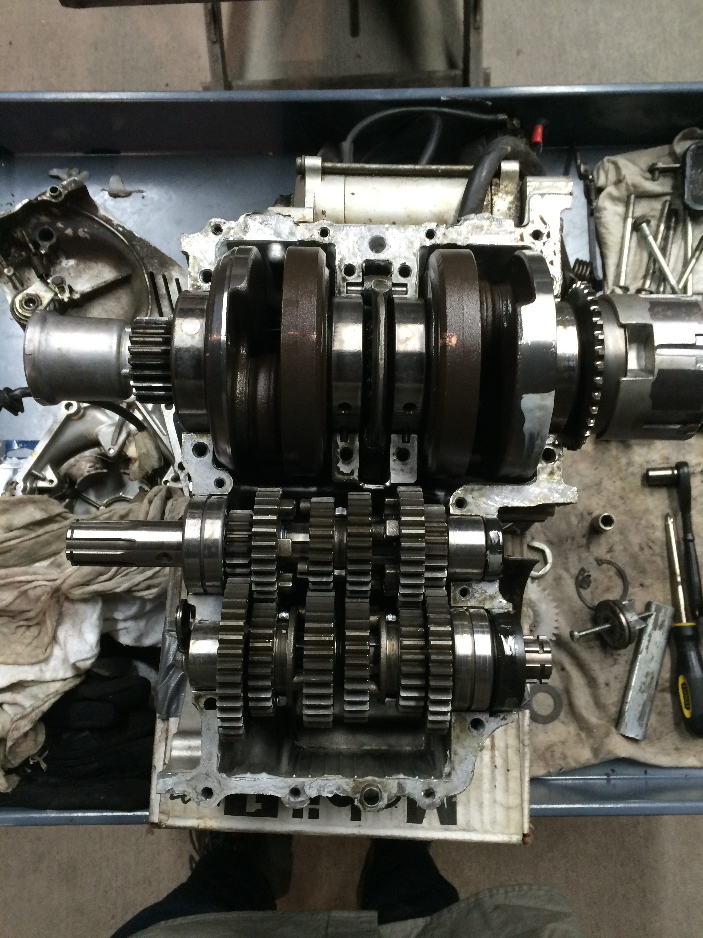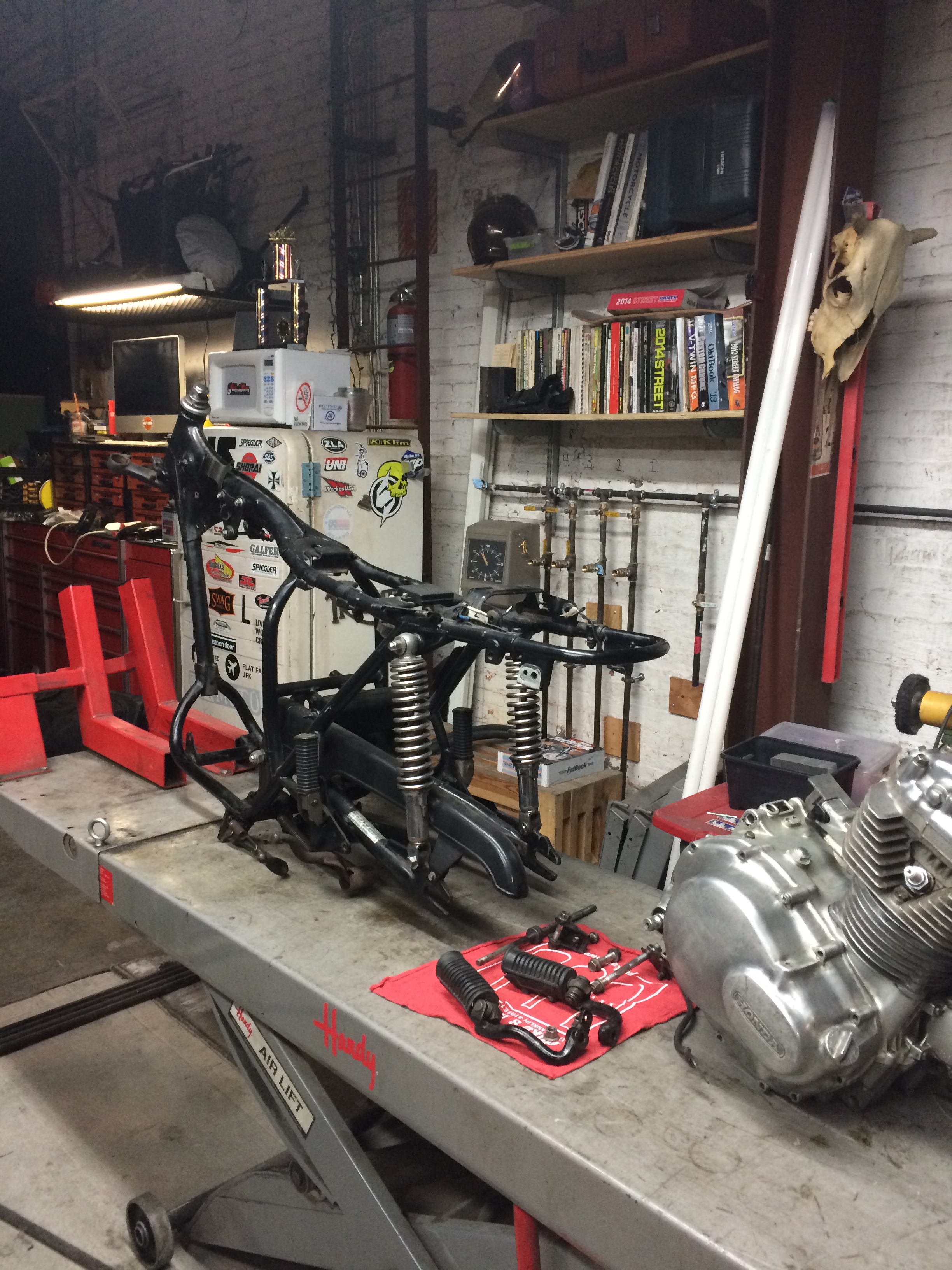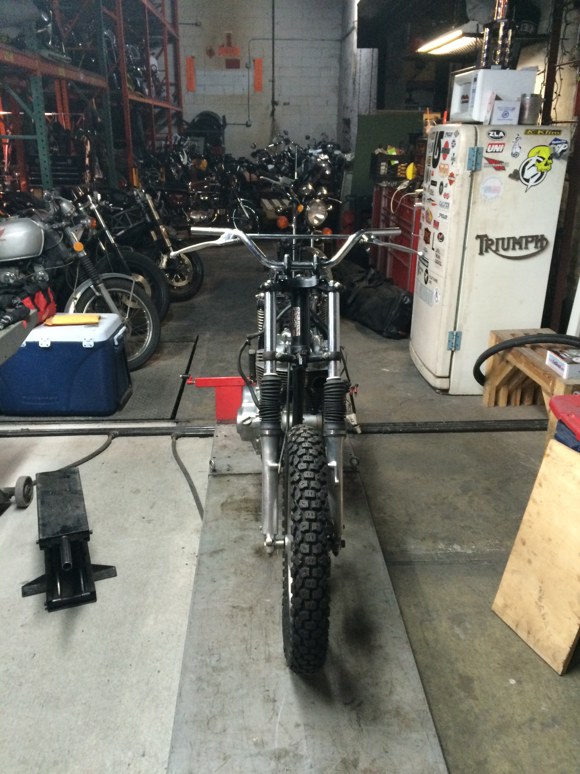 John replaced all necessary parts in the transmission and rebuilt it. Adding in new clutch discs the engine was put back together in sixty-five days. Not bad for a guy I know works 11+ hr days. Now the engine is in the frame as the photo shows, tires on and bars from the 70’s (Tomaselli’s).